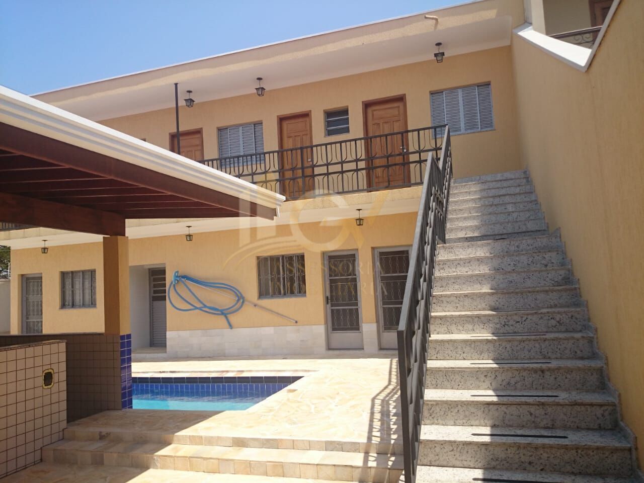 - Piscina central que conecta os dois blocos da casa, criando um ambiente de lazer e convivência.