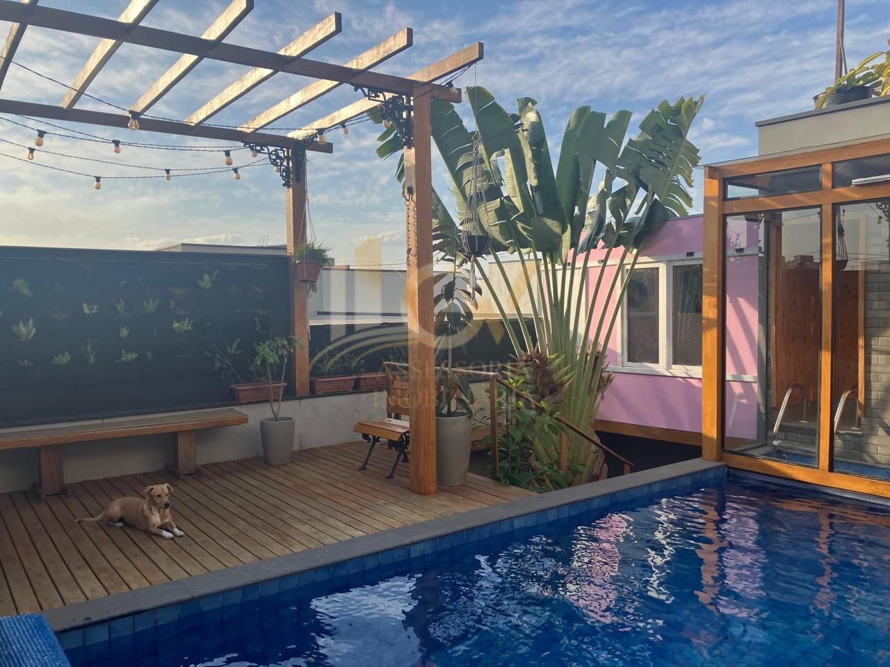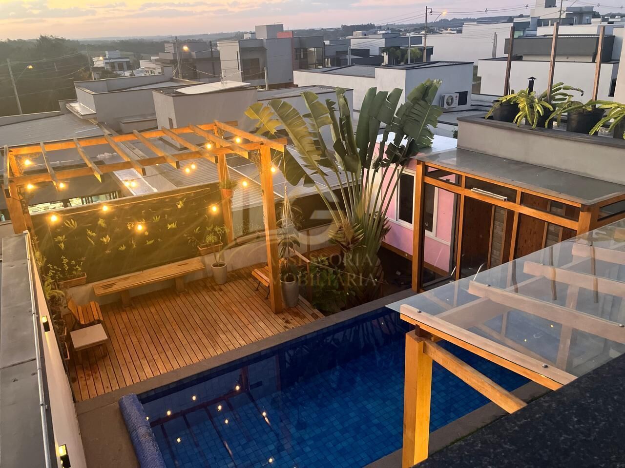- Área Externa: Piscina salinizada e aquecida de 15 mil litros, sauna seca, lavabo, deck com pergolado de madeira garapeira e brinquedoteca para crianças. Jardim amplo, casa de máquinas e cisterna.